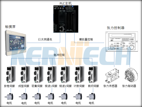 技術要點:放卷、張力控制、成型系統、密集、梳波1、梳波2、計數、切斷。