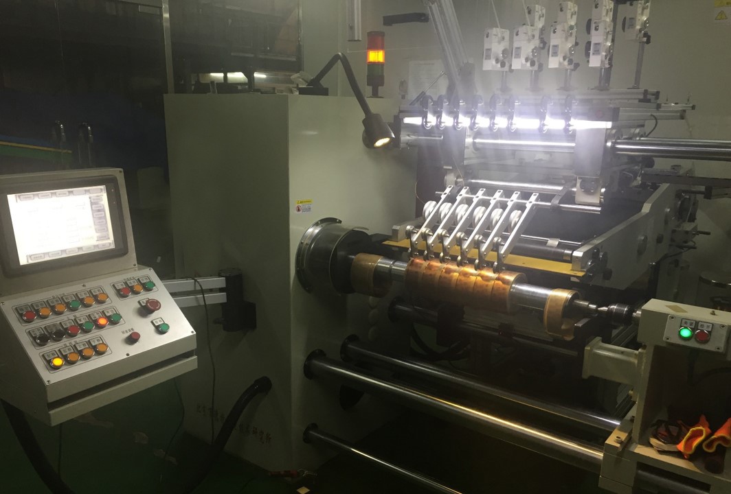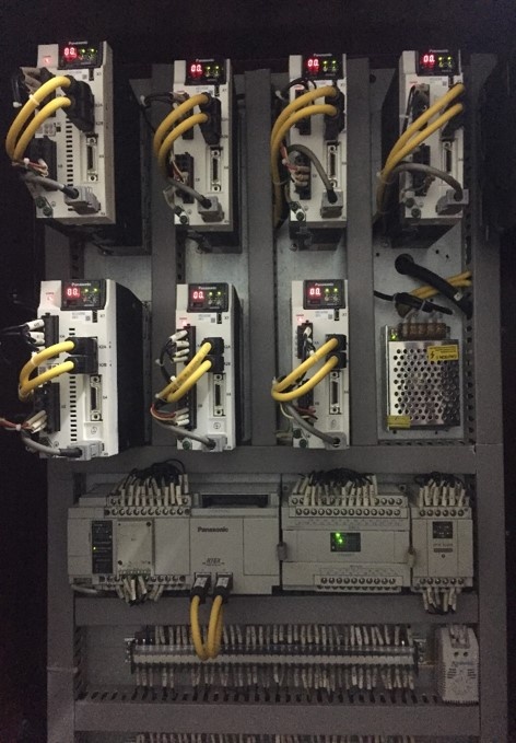 這是客戶自主研發的一種設備,歷時多年,一直未能開發成功,主要表現為電氣系統工作不穩定,無法正常使用。我們提供全新解決方案,使用松下運動控制PLC主機及威綸通觸摸屏,8臺松下RTEX伺服,使用松下激光位移測量線包直徑,為切刀進給,包紙長度計算,線架、紙架升降提供位置數據。難點在排線與上紙的配合上,各種特殊工藝都是排線與上紙的在不同參數下的組合。
