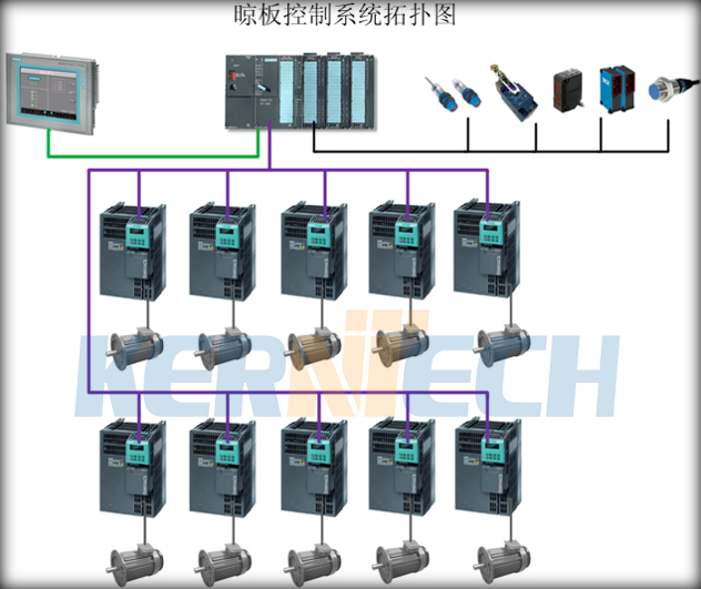 項目內容:系統采用西門子S7-300 PLC與多臺G120變頻器走DP通訊控制字對變頻器調速并顯示變頻器當前狀態,兩臺G120變頻器做同步控制,觸摸屏記錄修改板型,西門子S120網絡伺服控制。