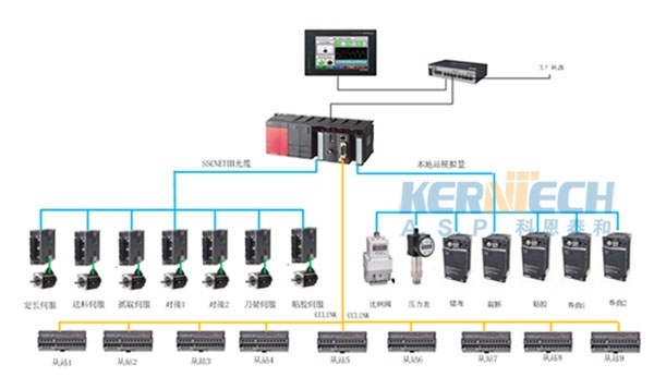 采用三菱Q系列以太網通訊CPU,配以三菱J4系列伺服電機7套,和PLC之間光纖通訊,三菱FR-E540變頻器五臺,控制收卷,放卷及裁斷。采用省配線系統,整個生產系設置CCLINK從站9套,輔助操作,本地配置GOT2000系列觸摸屏進行操作,同時具備以太網通訊和工廠網絡懸接。