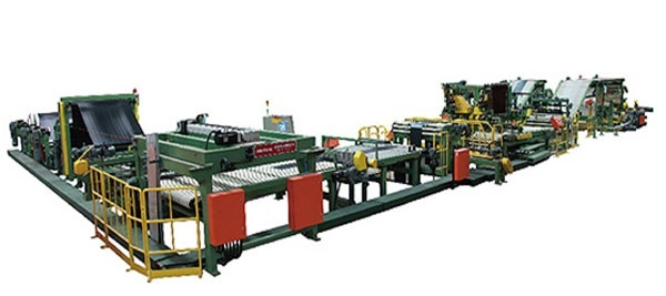 子午線輪胎簾布裁斷機將輪胎生產中的半成品纖維簾布大卷導開展平后,成一定角度進行定寬裁斷,然后將裁出的簾布條首尾相接進行接頭,再進行包邊與貼邊處理,最后卷曲成為帶束層簾布卷。機器由自動導開、定長送料、剪切、自動遞料、定位送料、接頭、定位卸料、儲料輸送、貼合及包邊、卷取等構成,設備要求高產量、高效率,同時又有裁切、拼接精準定位等要求。