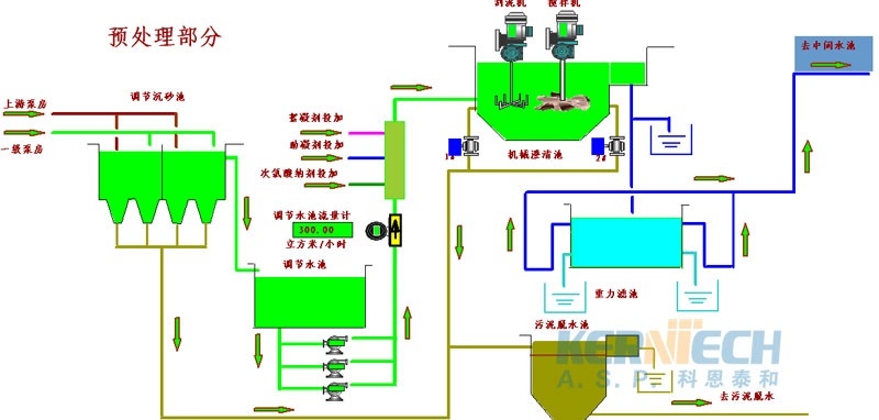預處理部分基本工藝介紹:一級提升泵311KW從原水池把水送入調節塵沙池,經過沉淀后自動流入調節水池,由二級提升泵311KW送入機械澄清池,輸送過程中進行加藥處理(絮凝劑投放,助凝劑投放,次氯酸鈉投放),機械澄清池設置刮泥機和攪拌電機,然后進入重力無砂濾池,再自動流入中間水池,塵沙池和機械澄清池的污泥通過水池下部流入污泥脫水池,排砂泵1.5KW進行污泥脫水外運。如下圖: