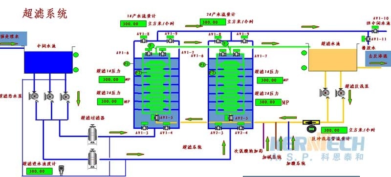 超濾部分基本工藝介紹:超濾供水泵322KW,超濾反洗泵245KW,超濾供水泵從中間水箱抽水經過超濾過濾器進入兩套超濾系統,對濁度進行監控,同時超濾一次測和二次測分別加裝壓力表和流量計,對產水進行統計。進入超濾產水箱,通過超濾反洗泵進行定期超濾系統的清洗。清洗水中進行加藥處理(加酸,加堿,加次氯酸鈉)同時增加流量計。如下圖: