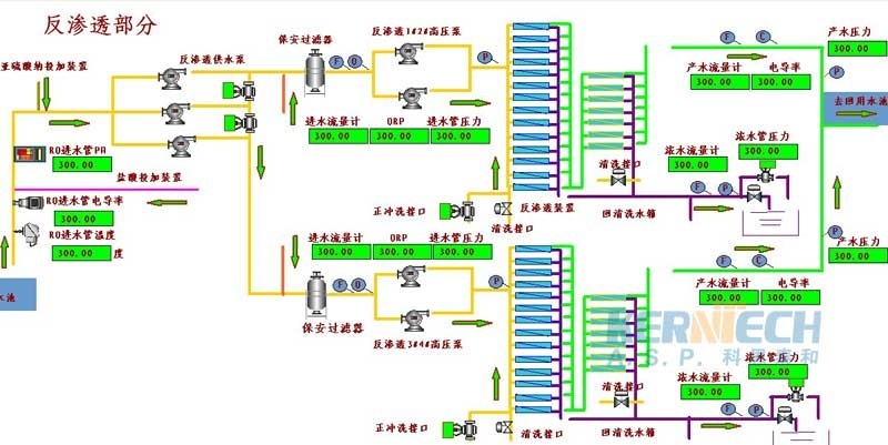 反滲透部分工藝介紹:反滲透15KW供水泵三臺,反滲透37KW高壓泵4臺,超濾出水后增加溫度,電導率,PH值監測,進行加酸加堿加藥,通過反滲透供水泵,保安過濾器,在經過反滲透高壓泵進入2套反滲透系統,監測流流量,ORP,和管道壓力,經過反滲透后,進入濃水水箱,監測濃水管道壓力和流量。原凈水池安裝三臺輸送泵,監測流量和壓力,配合反滲透的產水后進入回用水水池。如下圖: