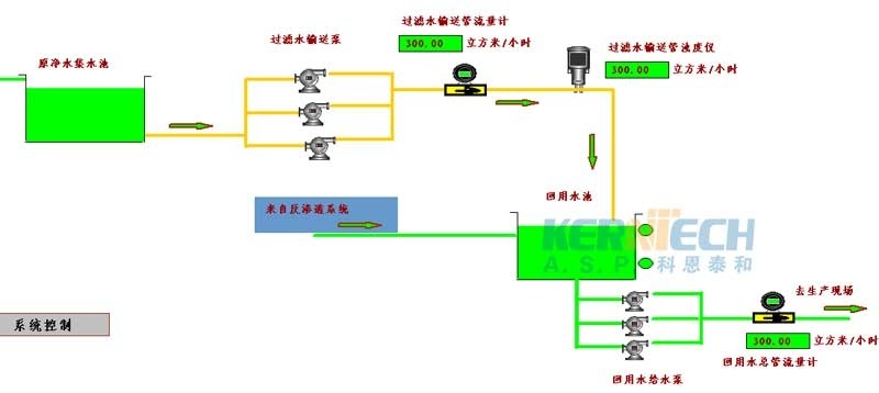 回用水部分工藝介紹:三臺原凈水池輸送泵5.5KW,加裝流量濁度監測,配合反滲透的系統產水,進入回用水池,通過回水3臺給水泵75KW,加裝流量計來完成整個水處理部分的工藝。