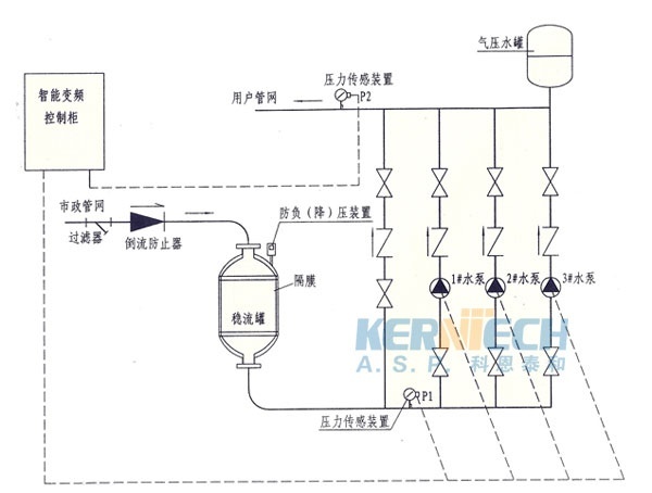變頻供水設(shè)備是一種直接與市政管網(wǎng)相連,而不會(huì)對(duì)市政管網(wǎng)產(chǎn)生影響的成套供水設(shè)備。將市政管網(wǎng)壓力和提升水泵的壓力進(jìn)行疊加,使生活供水更加節(jié)能和環(huán)保,是傳統(tǒng)二次供水理想的更新?lián)Q代產(chǎn)品。該設(shè)備由變頻控制柜、無(wú)負(fù)壓裝置,自動(dòng)化控制系統(tǒng)及遠(yuǎn)程監(jiān)控系統(tǒng)、水泵機(jī)組、穩(wěn)壓補(bǔ)償器、負(fù)壓消除器、壓力傳感器、閥門、儀表和管路系統(tǒng)等組成。隨著二次供水加壓技術(shù)的發(fā)展,變頻供水設(shè)備從根本上解決了這些問(wèn)題。變頻供水設(shè)備不需建造水塔,投資小、占地少,采用水氣自動(dòng)調(diào)節(jié)、自動(dòng)運(yùn)轉(zhuǎn)、節(jié)能與自來(lái)水自動(dòng)并網(wǎng),停電后仍可供水,調(diào)試后不需看管。