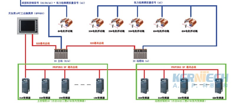 變頻器部分主要完成整個系統的牽引功能,44臺電機可以同時啟動,同時停止,每臺電機也可以單獨控制啟動停止,每臺變頻器速度系數可以修正,并且在運行過程中生效。由于要實現控制精度在0.01Hz,變頻器本身控制精度要等于或高于該給定的精度要求,由此我們選擇性價比較高的三菱A700系列變頻器,整個傳動部分需要44臺。支持Profibus-DP總線通訊協議。具備安全停機功能,防止變頻器意外啟動,控制面板可以熱插拔,參數拷貝等。散熱方式,冷板式及對流散熱。