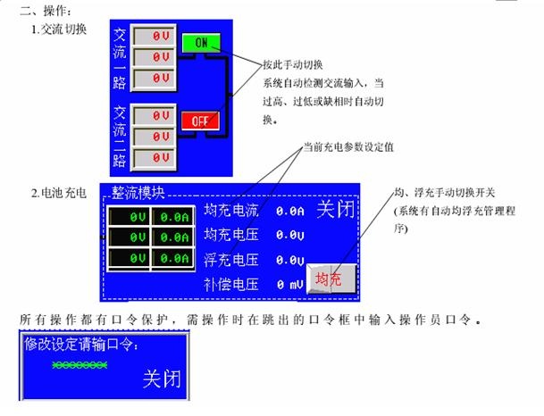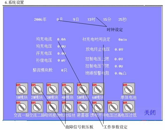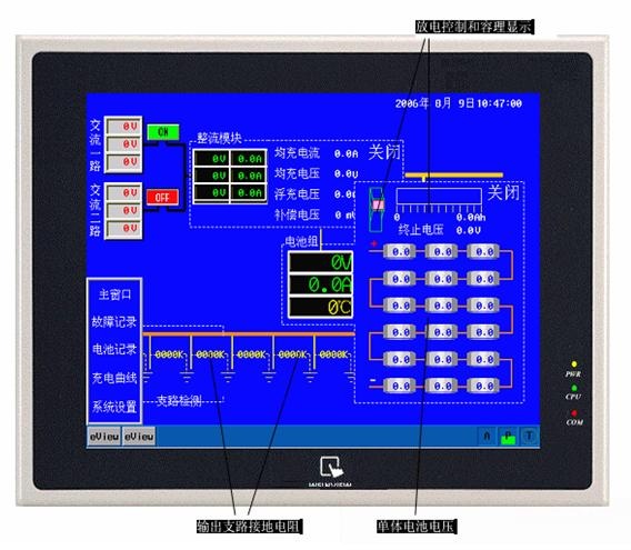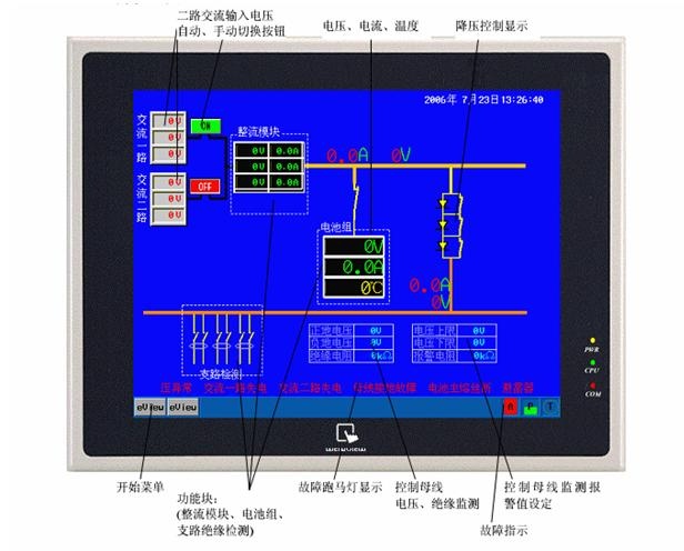 監控系統包括主監控器、電池巡檢儀、操作界面、支路饋線絕緣檢測傳感器等部份組成。功能完備、智能控制、無人值守,有自動化綜合管理接口。7.7英寸 彩色 DSTN 液晶屏、640×480 像素。數據記錄、掉電保持。