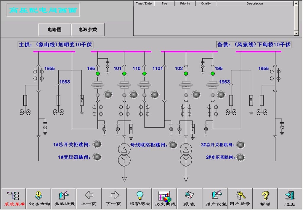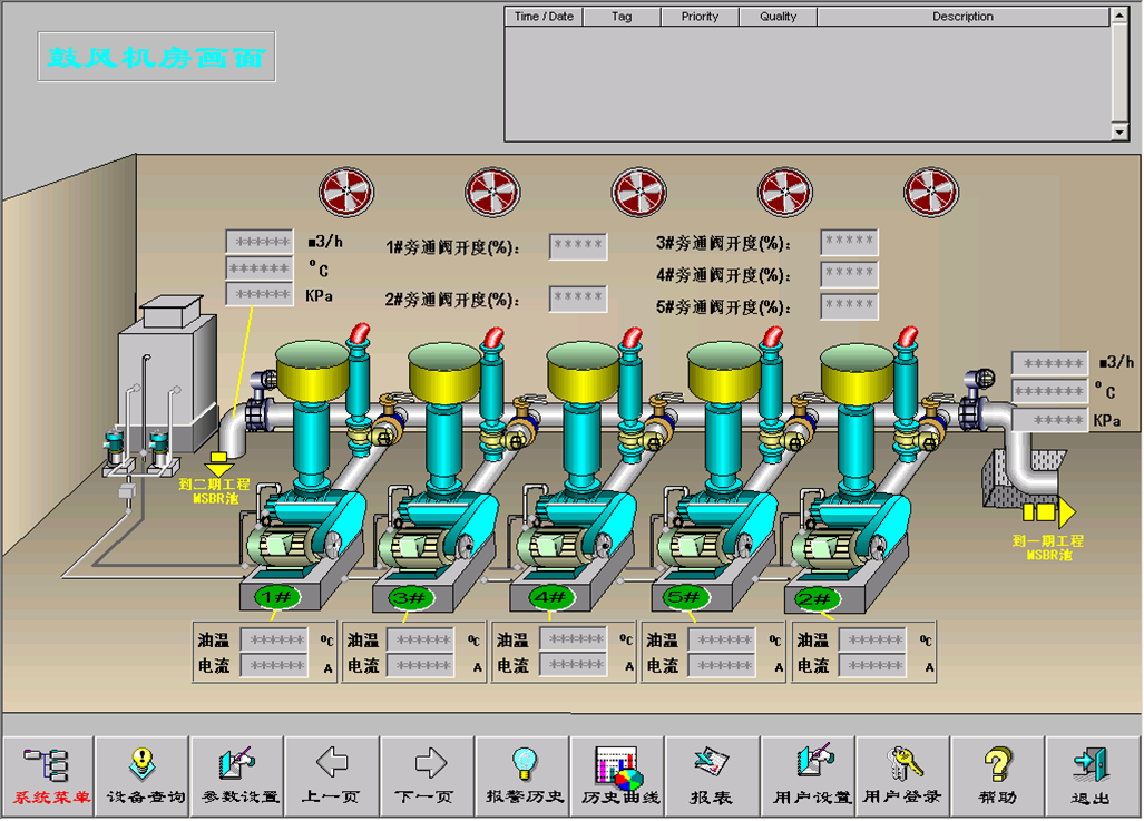 在鼓風機房,系統需要控制鼓風機組的開關機順序,檢測鼓風機組的故障報警,根據生化池中溶氧的濃度調節出風閥開啟度,檢測生化池等相關儀表的參數。在脫水機房系統需要采集脫水機房、污泥池內電氣設備運行工況及附近的儀表參數并對相應電氣設備進行控。在變電所需要采集鼓風機房高壓變配電所設備的運行工況及對附近電氣設備進行控制等。具有現場設備查詢,故障記錄及報警,各項數據曲線等功能。
