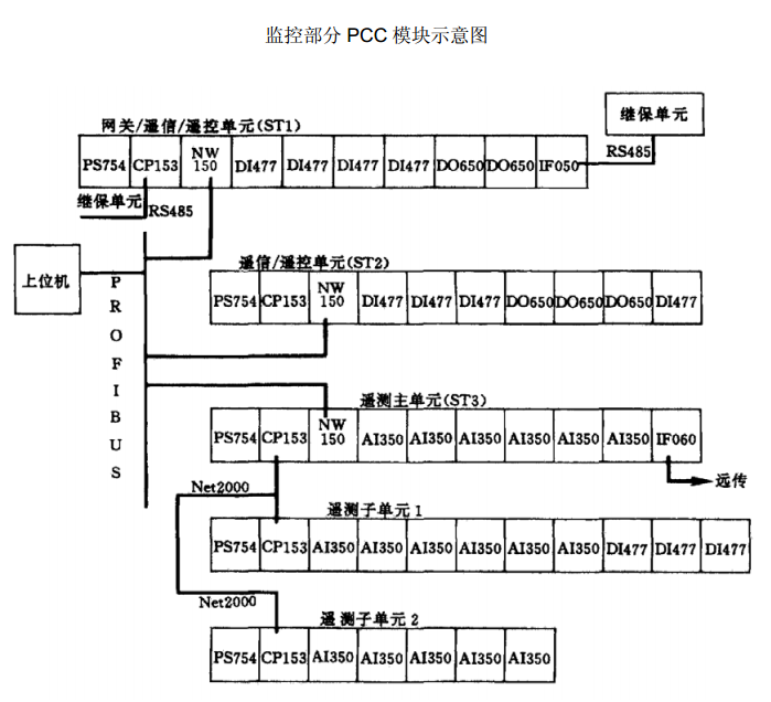 遙測(cè)實(shí)行交流采樣,遙測(cè)主單元ST3 通過(guò)net2000與兩個(gè)遙側(cè)子單元相連,利用CP153上的RS485 串行口通信。遠(yuǎn)傳功能通過(guò)IF060 提供的RS232 串行口來(lái)實(shí)現(xiàn)。