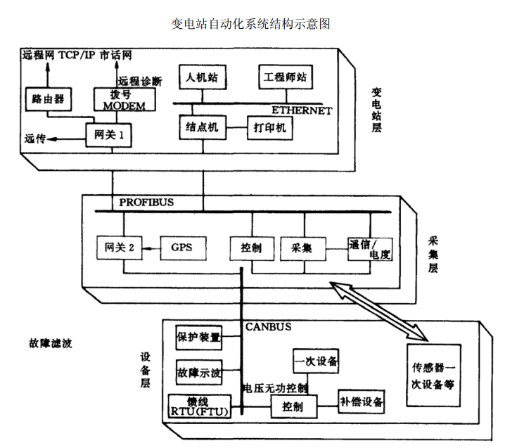 設(shè)備層根據(jù)現(xiàn)場(chǎng)總線( CANBUS ,PROFIBUS )網(wǎng)絡(luò)傳輸速率快(> = 50OkbS ) ,軟硬件實(shí)現(xiàn)簡(jiǎn)單等特點(diǎn),可以CANBUS (上述實(shí)例是通過(guò)RS485 等)來(lái)連接變電站內(nèi)的其他自動(dòng)化裝置和保護(hù)單元、故障錄波、饋線子站及無(wú)功補(bǔ)償設(shè)備等的主干網(wǎng),并通過(guò)現(xiàn)場(chǎng)總線網(wǎng)絡(luò)連接到采集層,與上一層進(jìn)行必要的數(shù)據(jù)通訊。