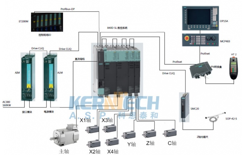SINUMERIK840D是由數(shù)控及驅(qū)動(dòng)單元(CCU或NCU),MMC,PLC模塊三部分組成,以動(dòng)龍門機(jī)床為例,一般機(jī)床分為主軸,X軸,Y軸,Z軸,C軸,X軸采用雙邊齒輪齒條同步傳動(dòng),單邊需要兩個(gè)驅(qū)動(dòng)進(jìn)行消隙控制。