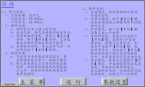 HMI界面主要由四個畫面組成,包括主菜單界面、運行界面、參數設置界面和幫助界面;提示彈出界面包括熄火提示界面和氣源超壓界面。