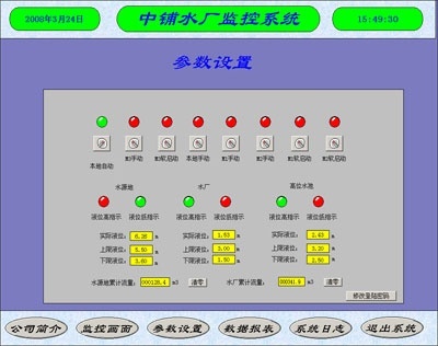水廠有800 立方米蓄水池一個, 液位計一套,液位計檢測水廠水位,當(dāng)水廠水位低時,及時給水源地水泵啟動信號。啟動水源地水泵上水,同時水廠有55KW電機(jī)兩臺,帶動兩臺水泵,向高位水池供水,流量計一個,用于檢測水廠水泵的流量,壓力表一個,用于檢測水源地的水泵壓力,通過流量和壓力的檢測能很好的檢測水泵的工作狀態(tài)。