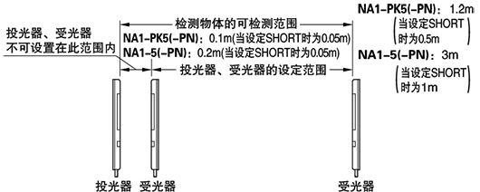(注2): 檢測距離是在投光器和受光器之間可設定的范圍。檢測物體的可檢測范圍、NA1-PK5(-PN):0.1m(當設定SHORT時為0.05m),NA1-5(-PN):0.2m(當設定SHORT時為0.05m)