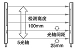 檢測距離0.2~3m (當設定SHORT時為0.05~1m) 光軸間距:25mm 檢測高度:100mm 檢測物體:?35mm以上的不透明體 |