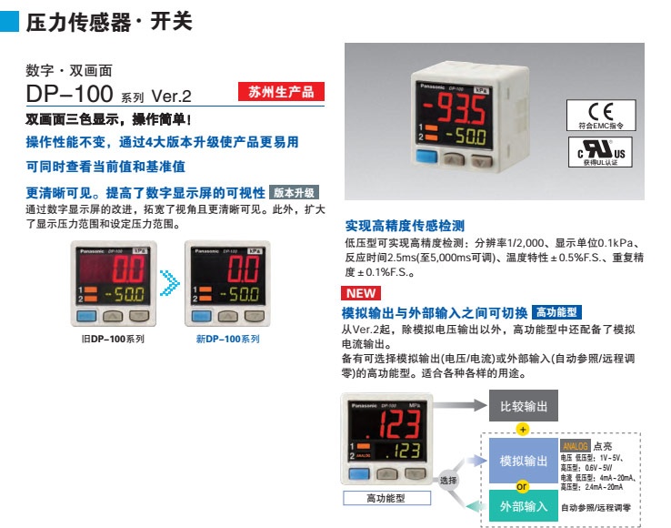 低壓型實現了分辨率 1/2,000的0.1kPa單位顯示、反應時間 2.5ms(最多5,000ms可變)、溫度特性±0.5%F.S.、重復精度 ±0.1%F.S.和高精度檢測。