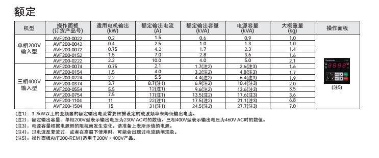| 機型 | 操作面板 | 適用電機輸出(kW) | 額定輸出電流(A) | 額定輸出容量(kVA) | 電源容量(kVA) | 大概重量(kg) | 操作面板 |