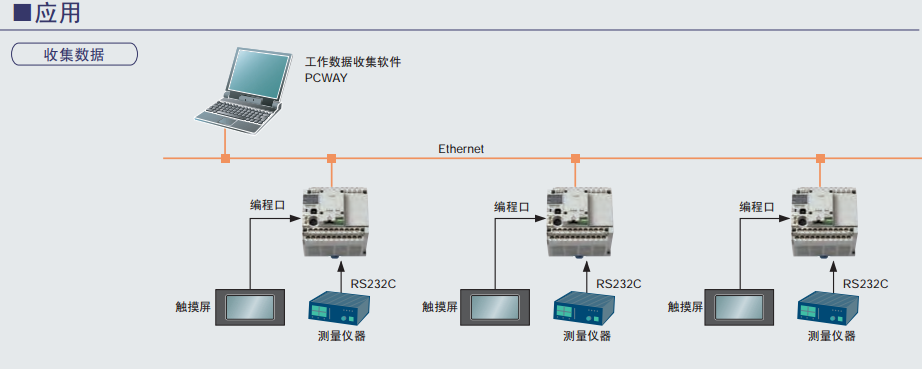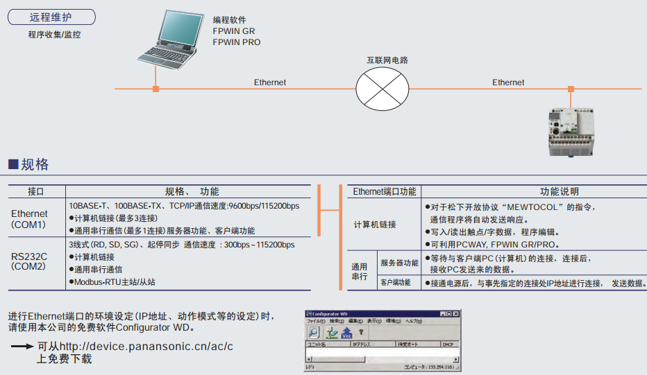 通信端口最大2通道本體配備一個RS232C編程口。另L40MR、L60MR還內置了RS485通信端口。 Modbus-RTU可以簡單的與全球通用的業界標準Modbus-RTU(二進制)的設備之間進行無程序通信。如與溫控器及變頻器等。 PLC連接如果使用L40MR,L60MR,可在最多16臺PLC之間實現位數據/字數據的共享。 計算機連接可簡單的與松下開放協議“MEWTOCOL”設備之間進行無程序通信。如顯示器、圖像處理裝置、溫控器、電力計等。 通用串行通信根據對方設備的通信協議生成/發送相應的指令。此外,還可以接收流動數據,如測量儀器,條形碼讀取器、RF-ID等。