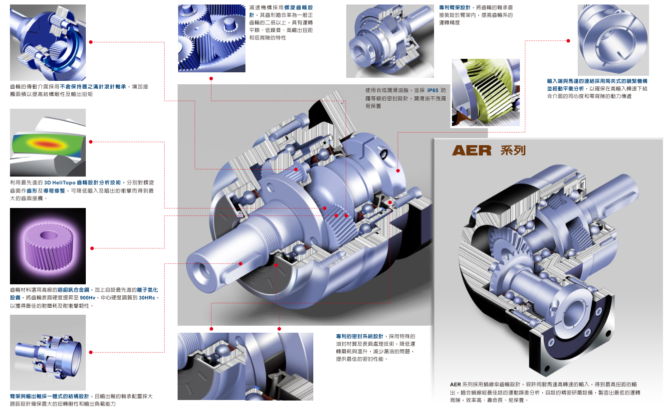 螺旋齒輪設(shè)計;筒夾式的鎖緊機構(gòu);馬達連接板的模組化設(shè)計;一體式的齒輪箱本體;NyoGel 792D 合成潤滑油脂;一體式的臂架;先進的離子氮化技術(shù);3D拓蹼的設(shè)計分析技術(shù);滿針的滾針軸承設(shè)計;輸出端專利的油封系統(tǒng)設(shè)計